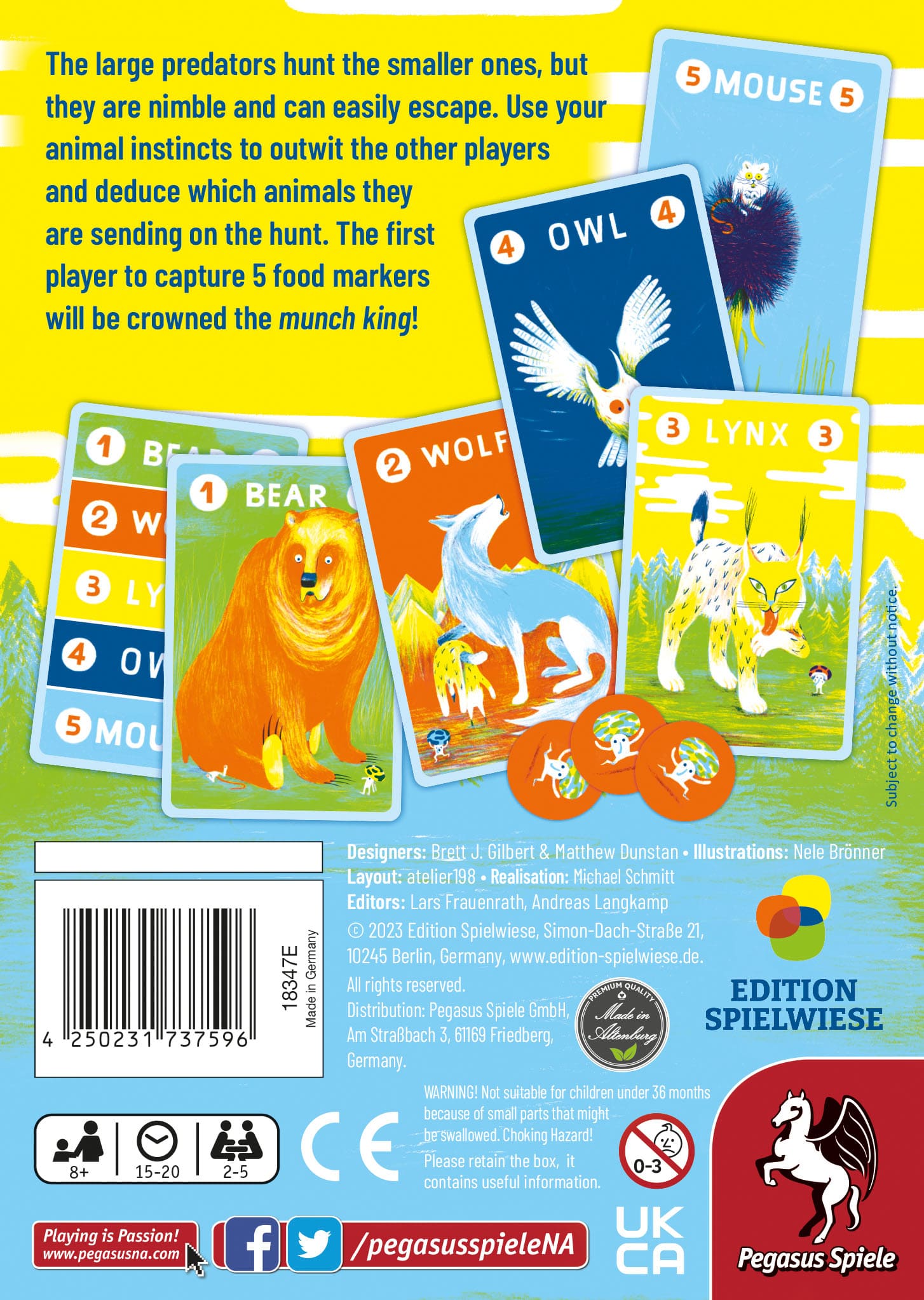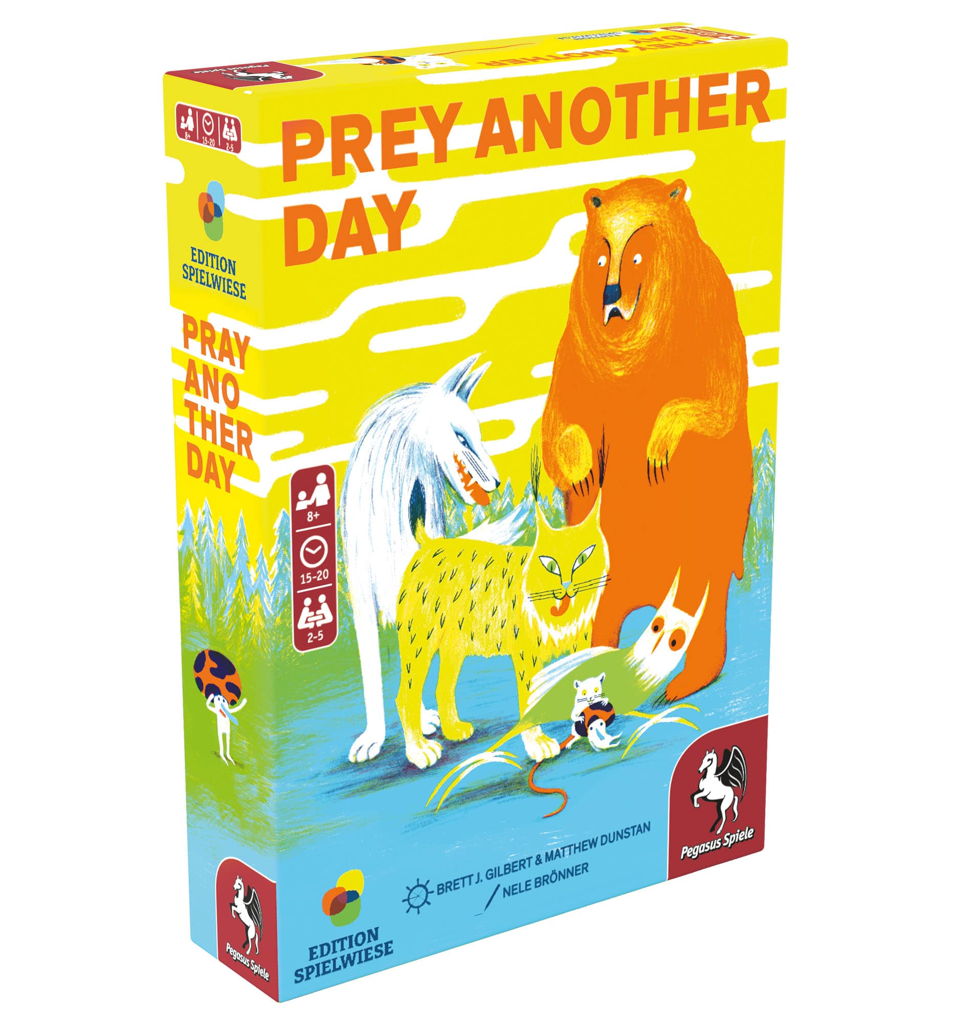 In Prey Another Day, players are forest animals hunting for food in the wilderness. Staring at the players around the table, you'll need to deduce when it is safe to hunt and when to stay hidden. In each round, players secretly choose one of the cards in their hand to play face down—bear, wolf, lynx, owl, or mouse. From largest to smallest and starting with bear, each animal will be called in turn. If alone, that player can declare a smaller animal to hunt and all matching face-down critters are revealed and eliminated. The round ends when only one animal remains, or after three hunts. Survivors receive valuable food markers, i.e. victory points, and the first player to collect 5 points wins!