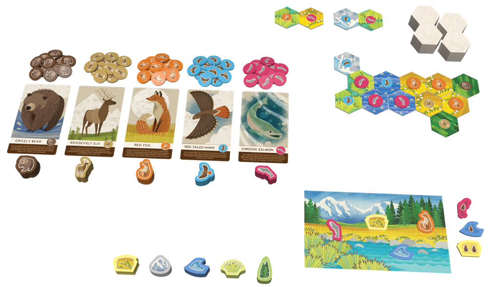 ¿Qué verás en tu aventura en Cascadia? ¡En tu turno, construye tu mapa y combina animales y hábitats para agregar avistamientos a tu panorama y ganar puntos! Cascadia Junior Permite a los jugadores más jóvenes experimentar el rompecabezas espacial del galardonado juego de mesa. Cascadia . Este juego independiente enseña la construcción de patrones, la recopilación de conjuntos y la suma básica. ¡Aprenda sobre osos, halcones, alces, salmones y zorros en esta tierra diversa de montañas, humedales, praderas, ríos y bosques!