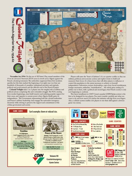 1 de noviembre de 1954: En vísperas del Día de Todos los Santos, miembros armados del Frente de Liberación Nacional (FLN) se rebelaron en toda Argelia contra el gobierno colonial francés. Las autoridades reprimieron rápidamente estos primeros incidentes, pero esta fecha marcó el inicio de una guerra de ocho años que dejó cientos de miles de bajas, atrocidades y represalias generalizadas, agitación política y social y el fin efectivo del Imperio francés. El insurgente, a partir de unos comienzos modestos, debe conseguir un apoyo popular masivo y duradero para su causa y organizarse para asumir el poder cuando Argelia finalmente logre su independencia. El Gobierno, que representa tanto a las autoridades coloniales como al liderazgo militar de Francia, debe enfrentar decisivamente a la insurgencia nacionalista mientras se esfuerza por preservar el apoyo y el compromiso del gobierno civil y la sociedad.<br><br><br><br>Los jugadores se adentrarán en el "corazón de las tinieblas" mientras usan acciones militares, políticas y económicas y explotan los eventos para construir y maniobrar fuerzas para influir o controlar a la población o, de lo contrario, lograr sus objetivos a lo largo de la sinuosa ruta hacia la independencia. Subversión, tortura, faccionalismo, golpes de estado, reasentamientos forzados, santuarios extranjeros, emboscadas, “neutralización”… todo el sombrío catálogo de una guerra despiadada está ahí, con un legado político y moral que la sociedad francesa apenas ahora comienza a enfrentar.<br><br>Esta última entrega del popular sistema COIN Series de GMT es la primera en estar diseñada para dos jugadores. Debes considerar cuidadosamente qué es lo que quieres hacer y cuánto quieres hacer antes de que la iniciativa se te escape de las manos. Además, un sistema de solitario completo permite a los jugadores individuales poner a prueba sus habilidades contra un enemigo astuto dirigido por el juego.</p>