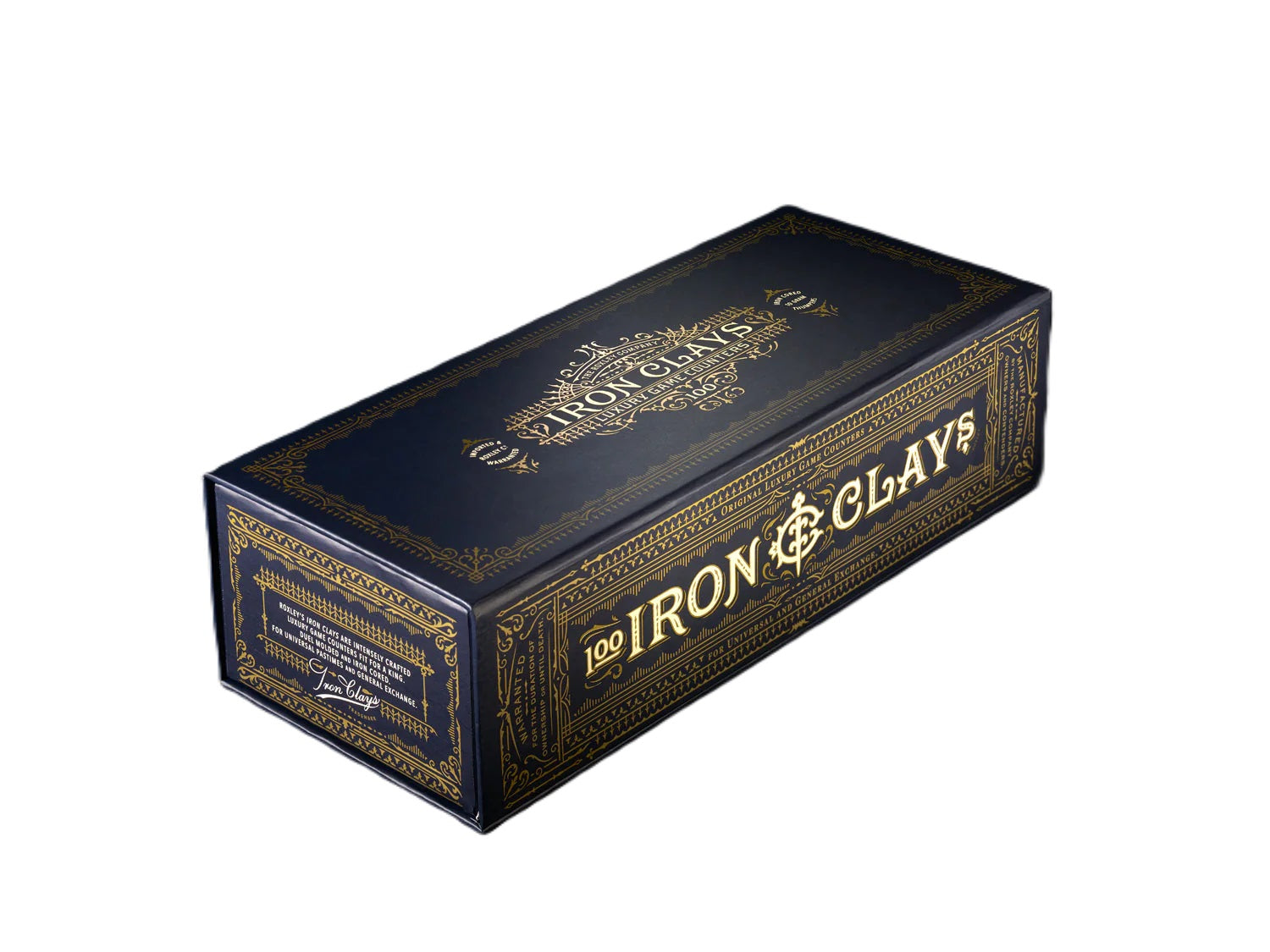Las arcillas de hierro 100 se entregan en una caja resistente, estampada en papel de aluminio y sellada magnéticamente. Dentro de la caja, las arcillas se almacenan en bandejas de plástico apilables, lo que les permite permanecer en la mesa de juego, accesibles para usted y sus oponentes.