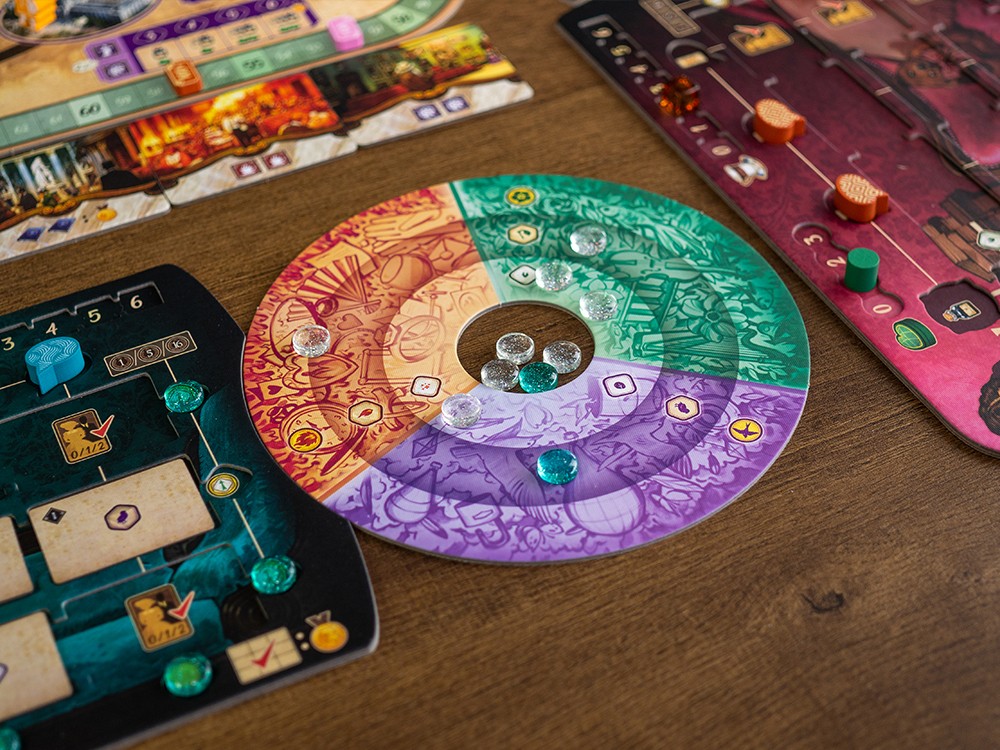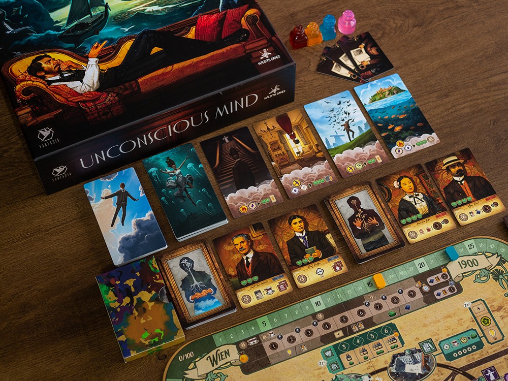 Unconscious Mind es un juego de estilo europeo que incluye colocación de trabajadores, construcción de motores, múltiples rondeles y efectos en cascada. En tu turno, puedes colocar una o dos Ideas (trabajadores) en una Mesa de Reunión central para acceder a una variedad de acciones, como agregar fichas a tu tablero de jugador, redactar y jugar cartas y moverte por la ciudad de Viena. El lugar donde colocas tus Ideas también determina qué tan lejos avanzar el tintero de tu rondel, activando una fila o columna de efectos de fichas en tu tablero de jugador.
