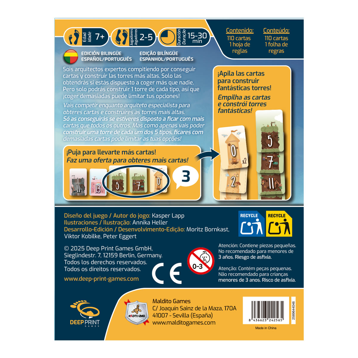 En 5 Torres, los jugadores compiten como maestros arquitectos para construir las torres más altas de la ciudad. En cada ronda, se pujan 5 cartas (los bloques de construcción de las torres). El jugador que consiga la mayor cantidad gana y debe añadirlas a sus propias torres en crecimiento. ¿Pero por qué no quedarse con todas? Solo se puede construir una torre de cada tipo, y el valor de las cartas de cada torre debe disminuir gradualmente a medida que se construyen, por lo que tomar demasiadas a la vez limita las futuras pujas. Cuando se coloca el último ladrillo, gana el jugador con más puntos.