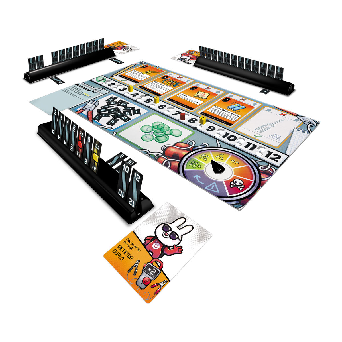 Há uma bomba cheia de fios e a contagem decrescente começou… Quem vai ser chamado? VOCÊS, os Caça Bombas! Para desativarem a bomba, têm de COLABORAR como um grupo unido de especialistas em bombas e armadilhas! Utilizando os fios no suporte de peças à vossa frente, devem DESCOBRIR todos os fios dos vossos colegas. Encontrem e cortem os fios idênticos, mas cuidado! Se cortarem um fio VERMELHO: BOOM! Utilizem os vossos equipamentos com sabedoria para enfrentarem os vários desafios, que se tornarão cada vez mais difíceis. Tiquetaque, tiquetaque… Conseguirão descobrir tudo antes que seja tarde demais?