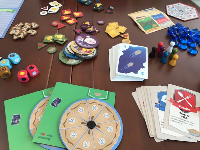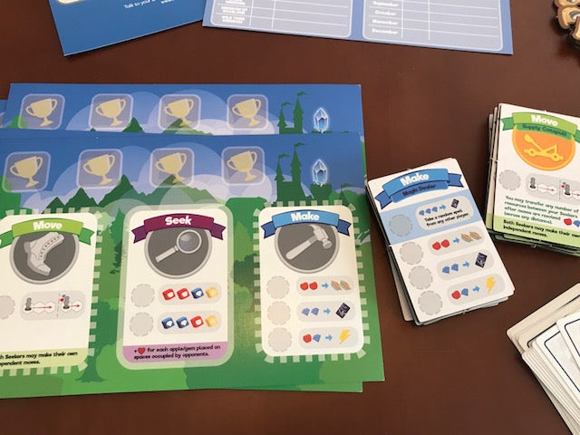 In an effort to be the first to earn 4 trophies from 8 possible categories, players take turns choosing to Move, Seek, or Make. These actions will allow players to increase their friendship and pies, power up their actions using upgrade tiles, complete quests, learn magic spells, discover precious resources through an innovative dice mechanism, deliver gems and apples to Castle Everfree, and perhaps even engage in a pie fight.