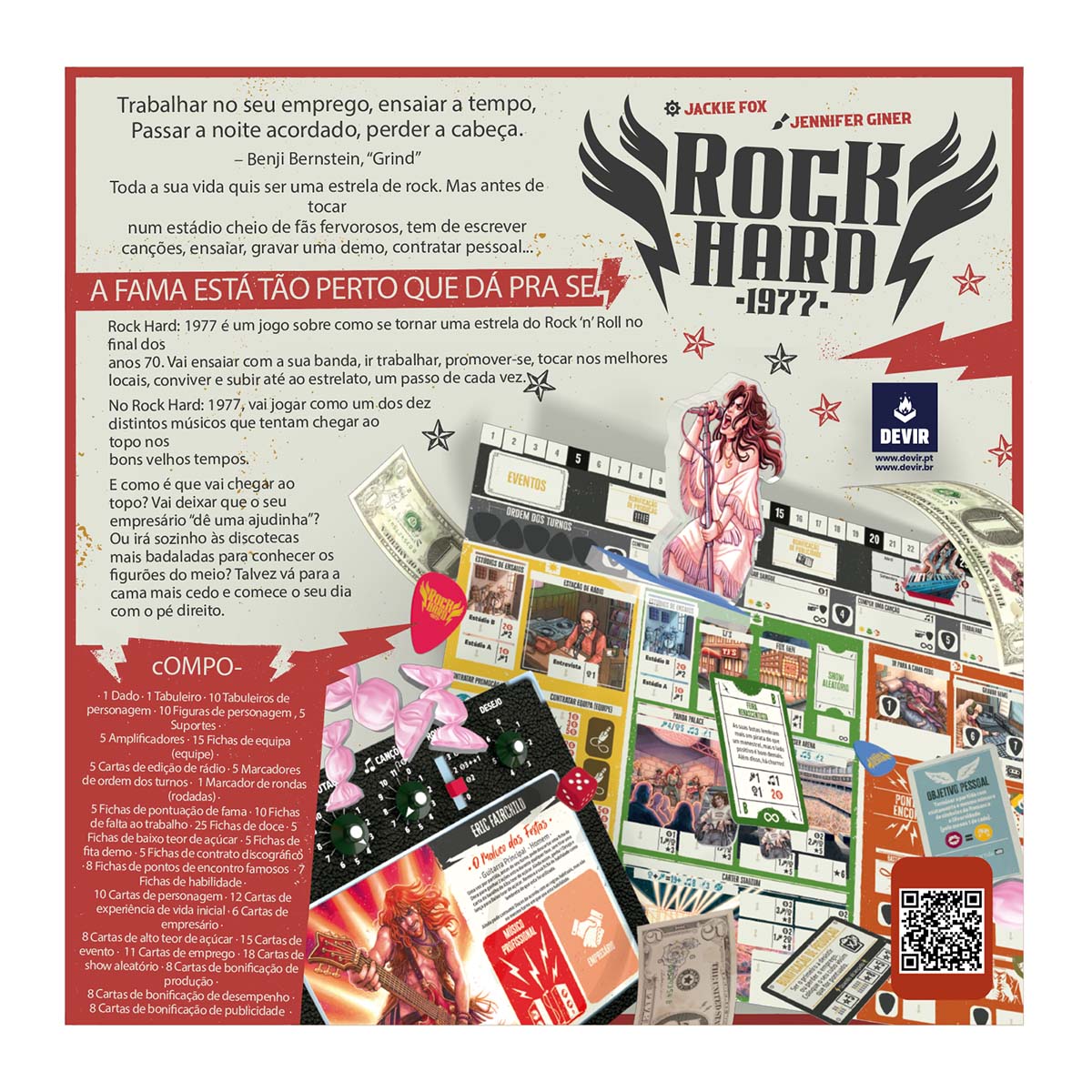 Criado por Jackie Fox (membro da banda de rock dos anos 70 "The Runaways", quatro vezes campeão do Jeopardy! e criador da trilogia de aventura narrativa "As Aventuras dos Chubby Slugz") e ilustrado por Jennifer Giner, "Rock Hard: 1977" permite jogos para grupos de 2 a 5 jogadores, a partir dos 14 anos, com a duração de 45 a 90 minutos.